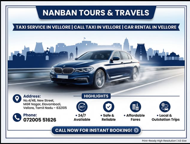 At Nanban Tours & Travels, we provide 24/7 taxi and car rental services for local trips, outstation travel, and airport pickup & drop. With 14+ years of experience and 1000+ successful rides, we are committed to offering safe, comfortable, and affordable travel solutions. Our well-maintained vehicles and professional drivers ensure every journey is smooth, punctual, and stress-free.